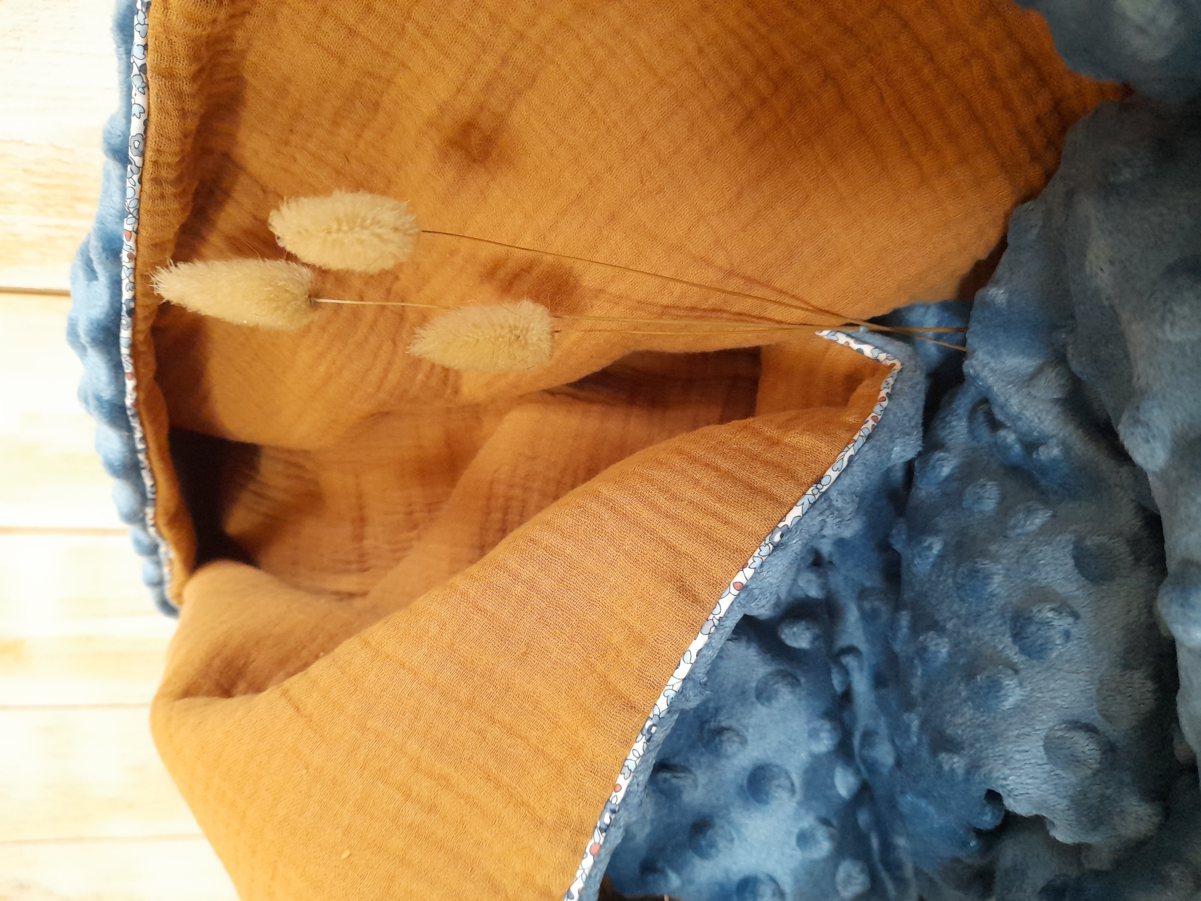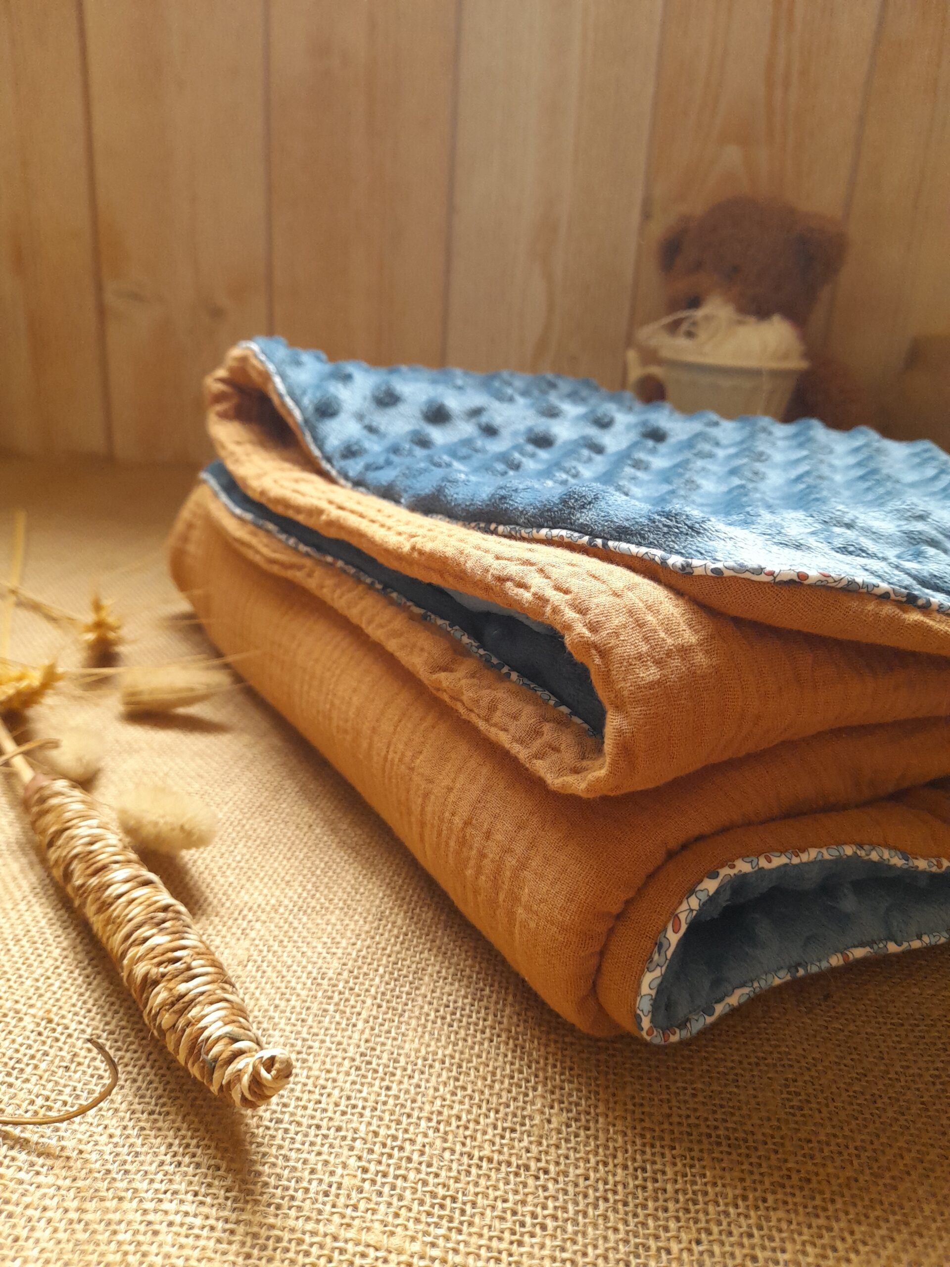 Un côté en double gaze de coton oeko tex pois doré, un autre côté en minky (polyester), intérieur ouate de rembourrage