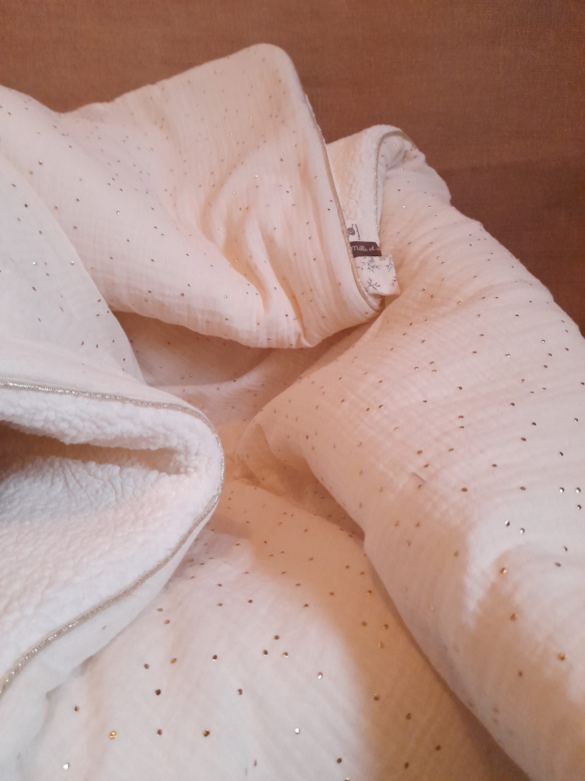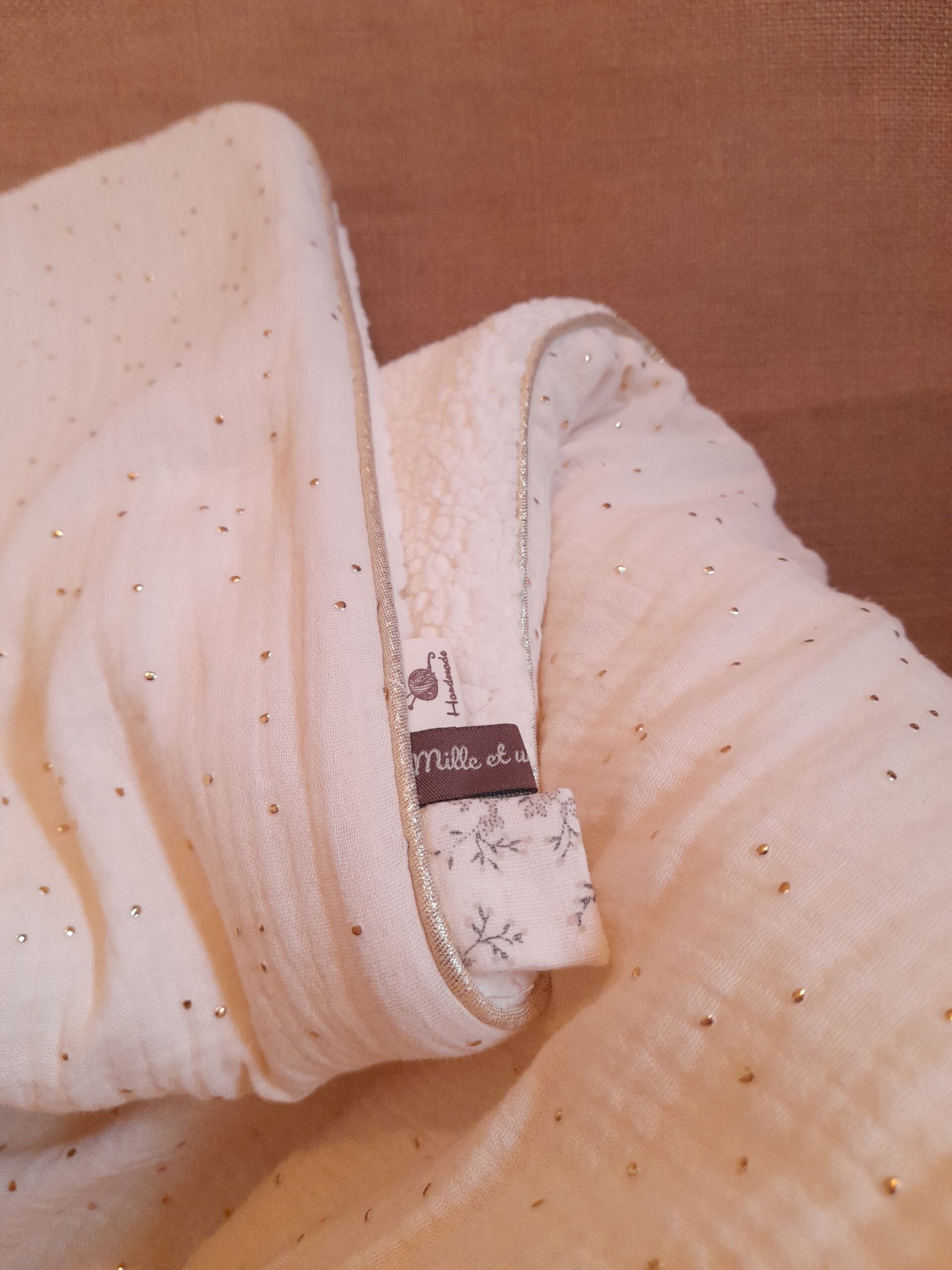 Un côté en double gaze de coton oeko tex pois doré, un autre côté en minky (polyester), intérieur ouate de rembourrage