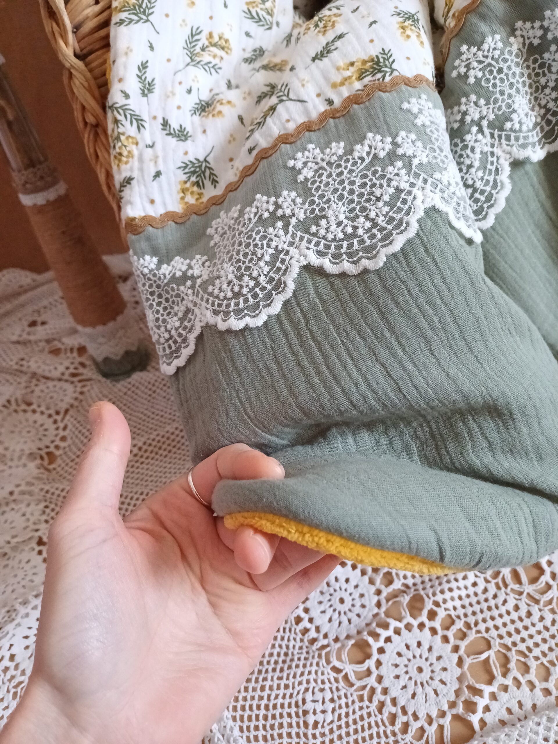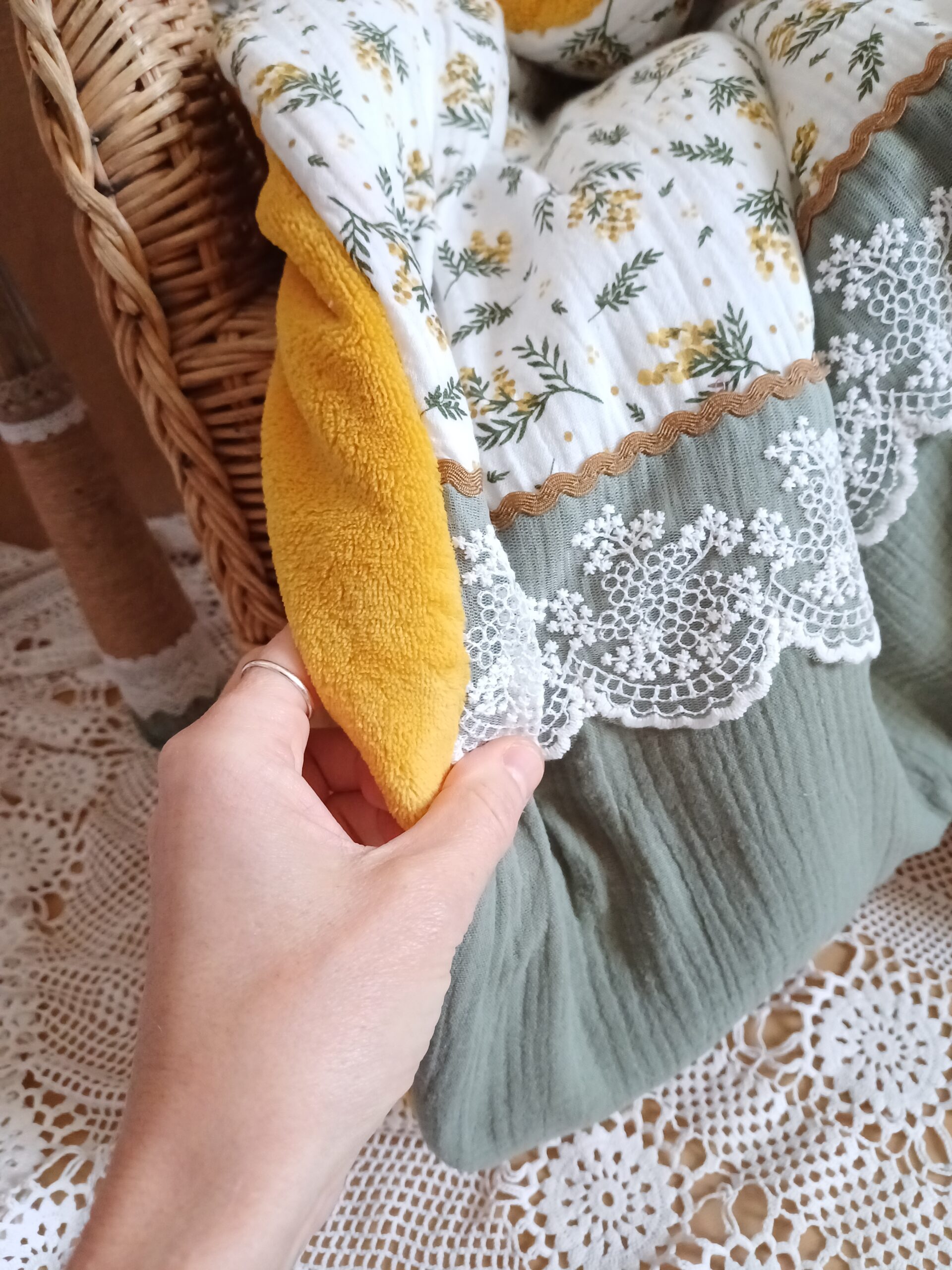 Un côté en double gaze de coton oeko tex pois doré, un autre côté en minky (polyester), intérieur ouate de rembourrage