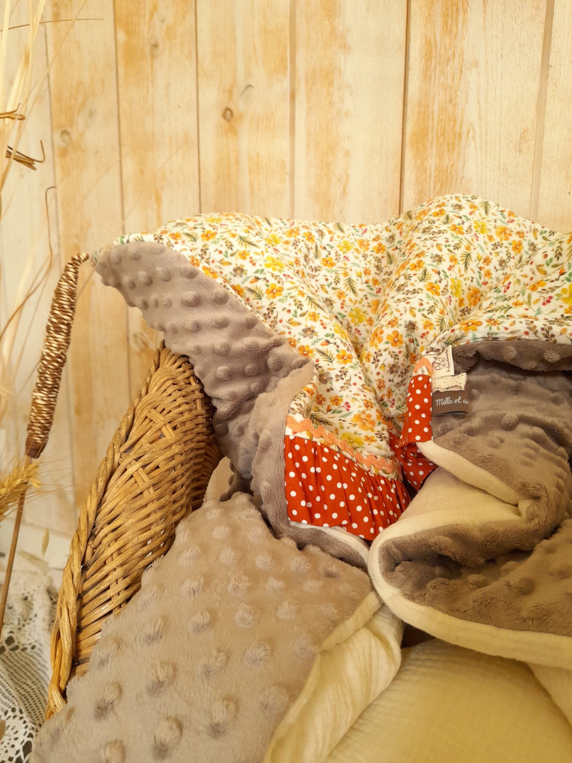 Un côté en double gaze de coton oeko tex pois doré, un autre côté en minky (polyester), intérieur ouate de rembourrage