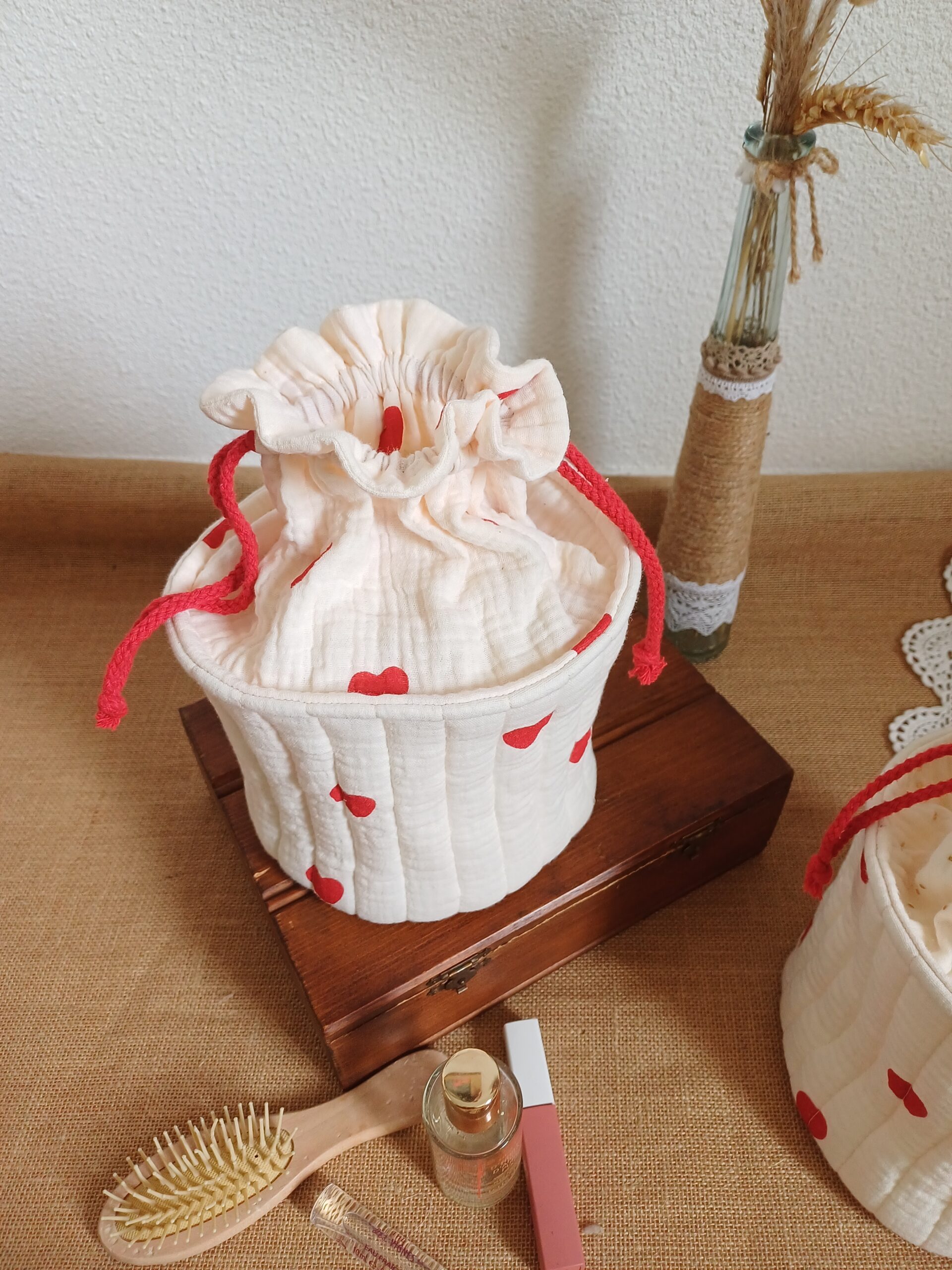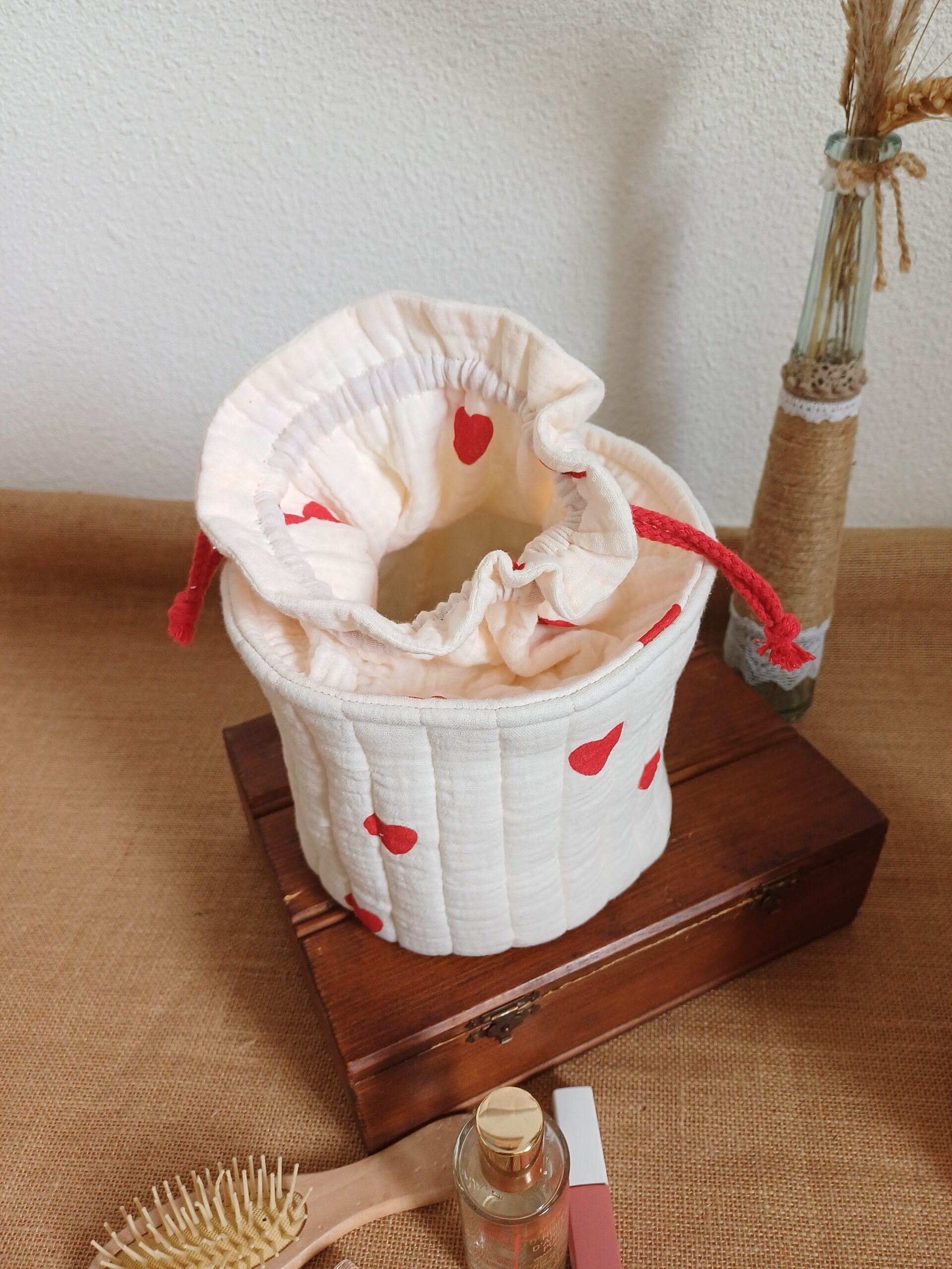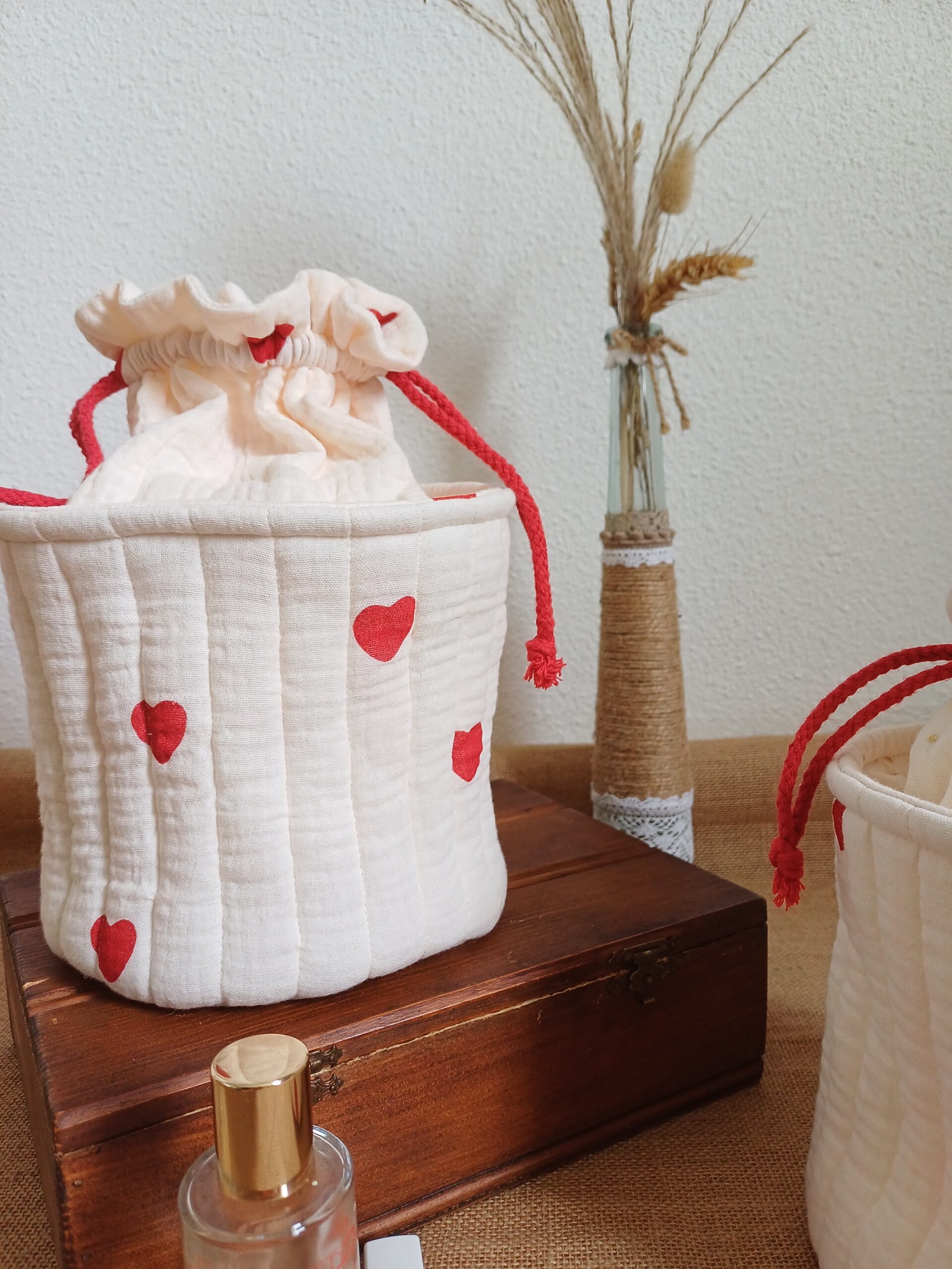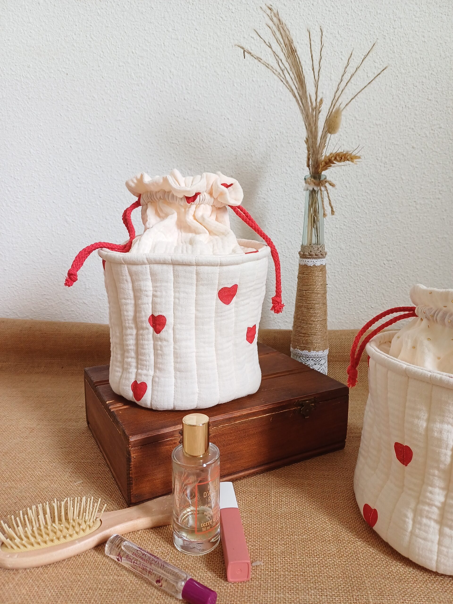Tu pourras l’adapter à tes besoins en y glissant ton nécessaire de toilette le temps d’une escapade en amoureux ou entre copine. Ici c’est devenu la boîte à mouchoirs et j’adore !!