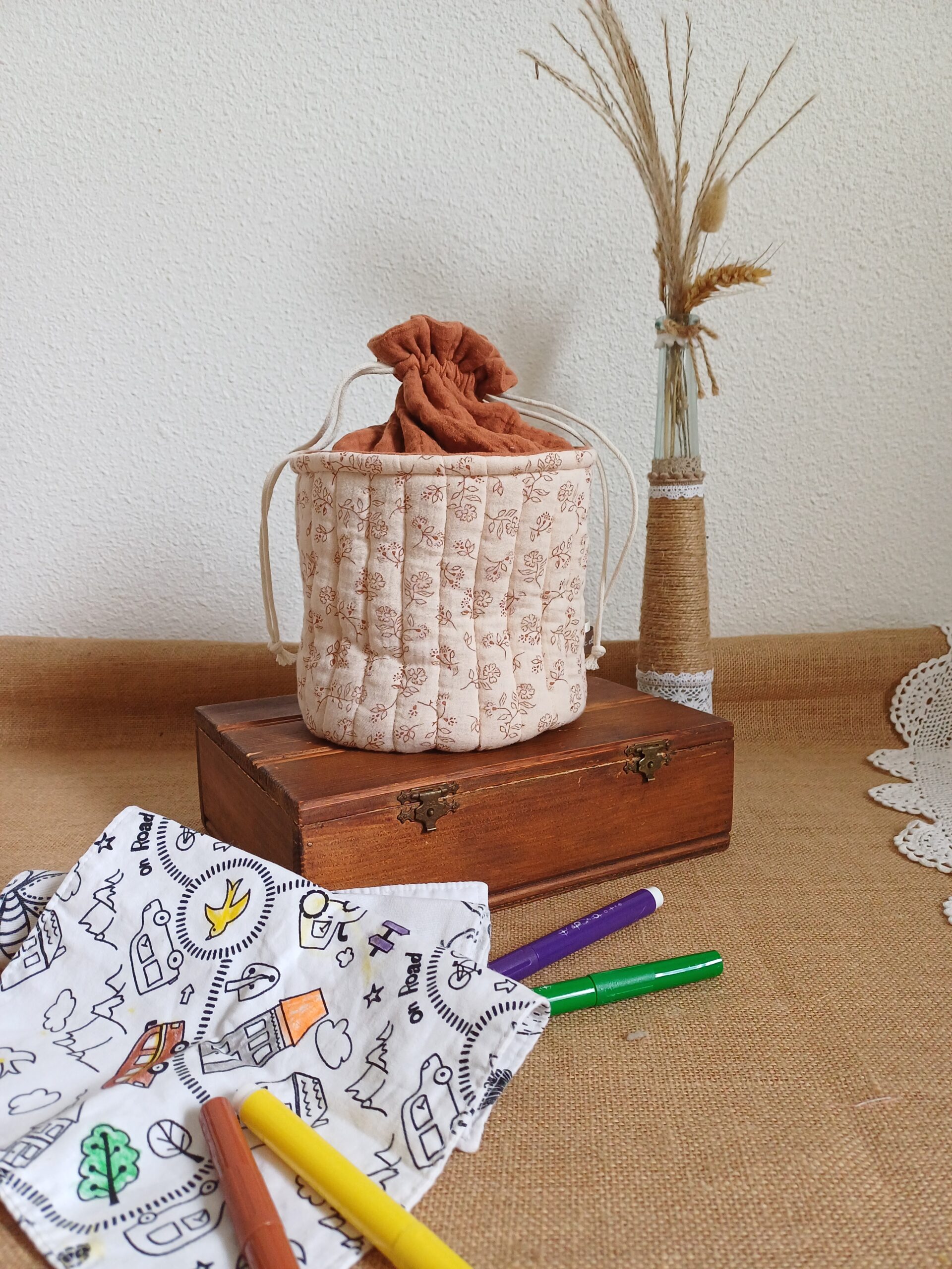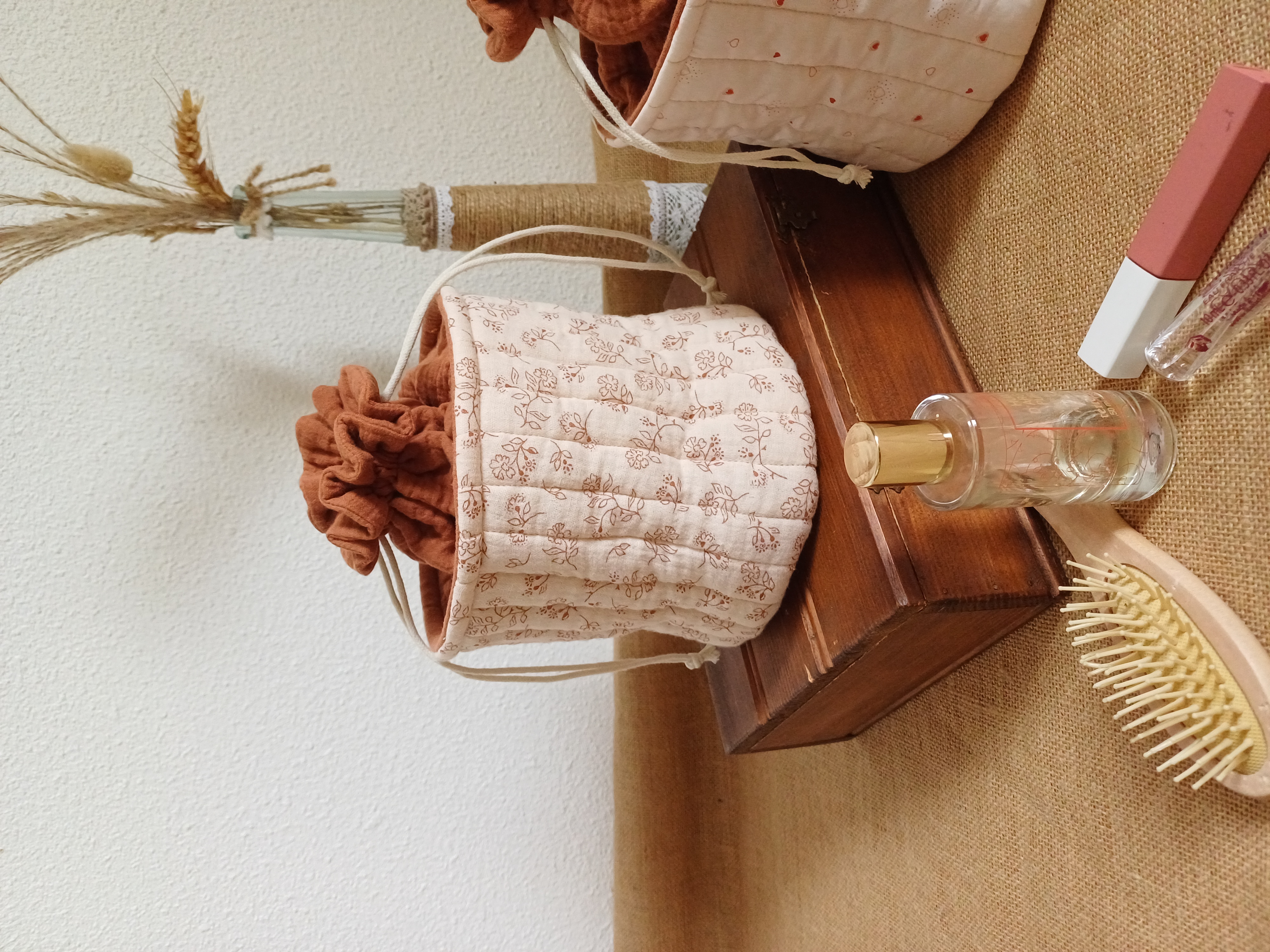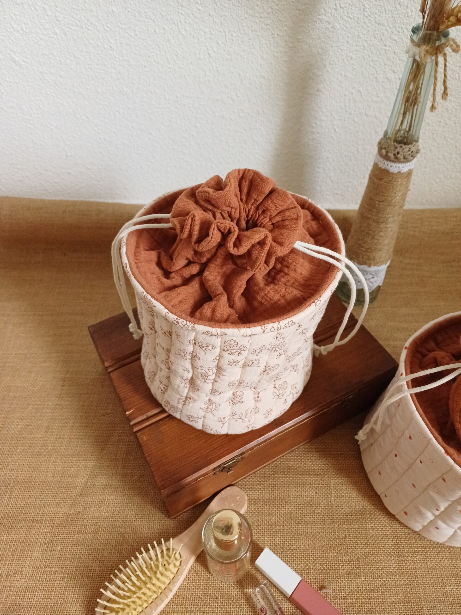 Tu pourras l’adapter à tes besoins en y glissant ton nécessaire de toilette le temps d’une escapade en amoureux ou entre copine. Ici c’est devenu la boîte à mouchoirs et j’adore !!