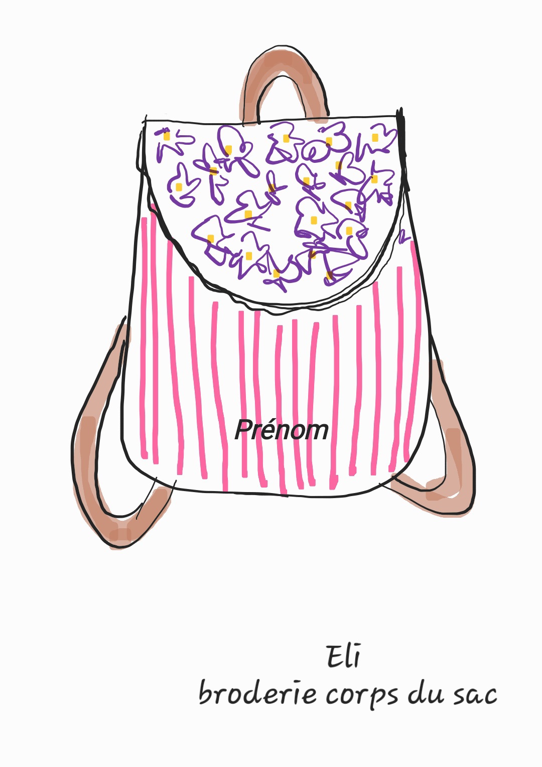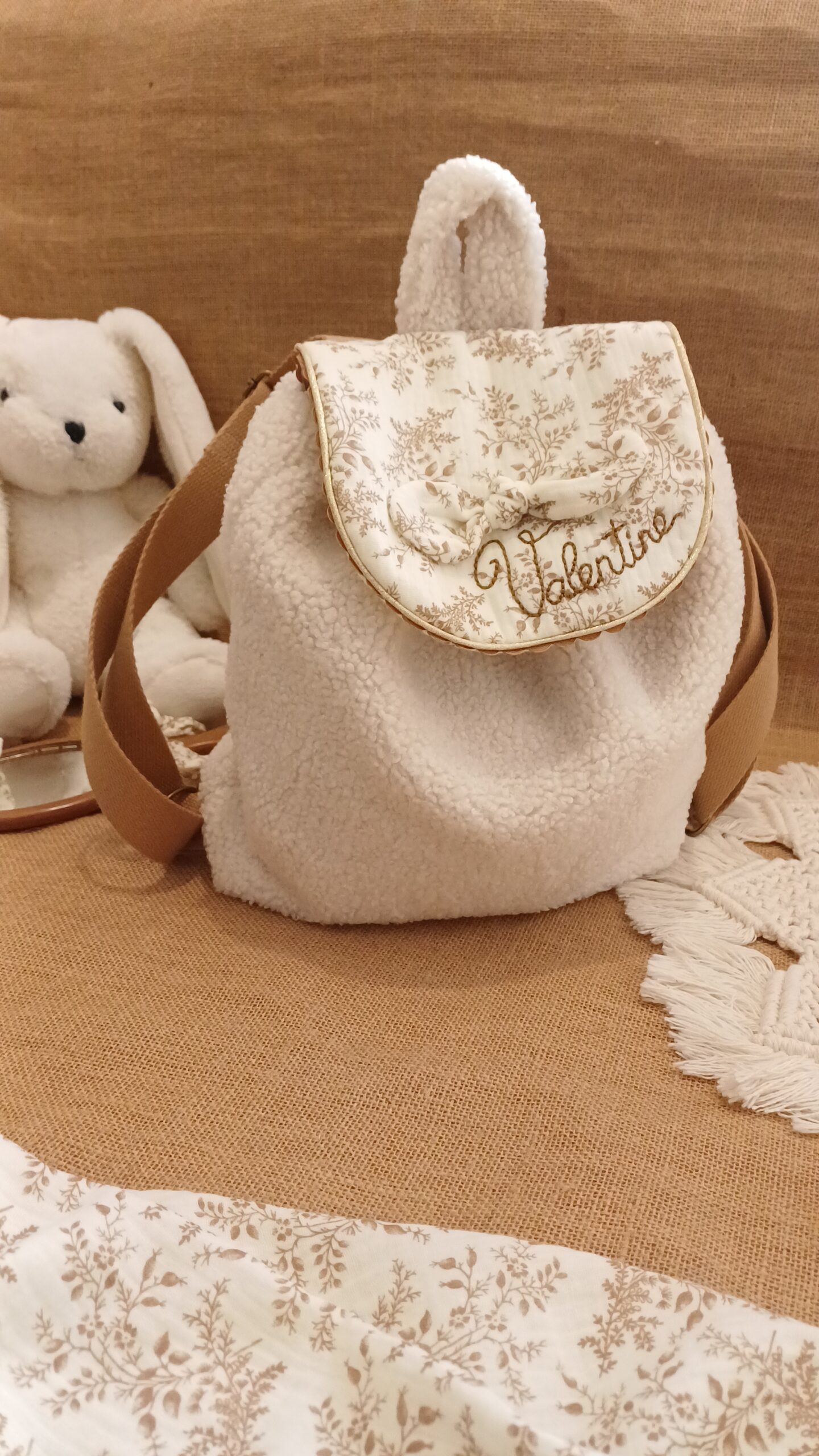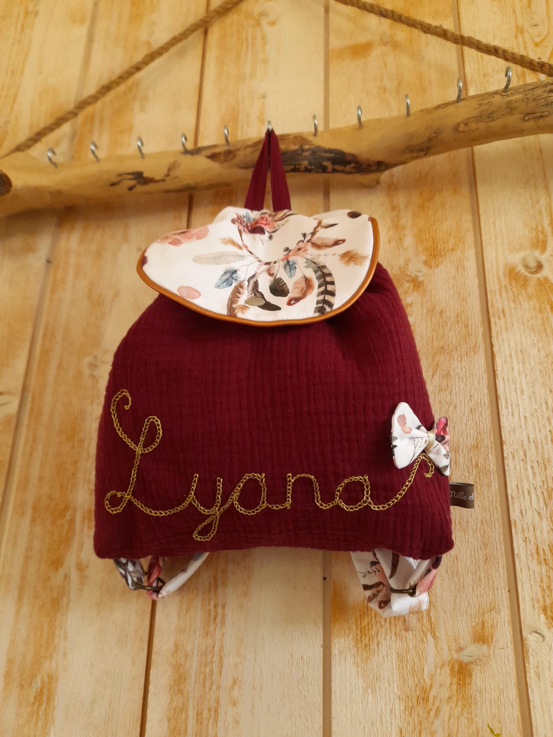 Il est possible de broder le prénom, soit sur le rabat du sac soit sur le corps du sac (hors tissu bouclette)