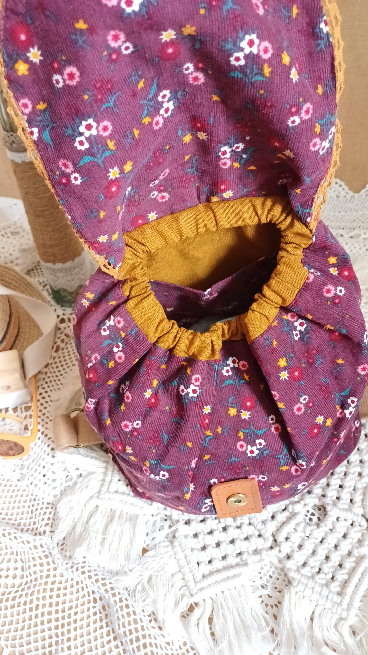 Idéal pour la première rentrée à la crèche et à l’école. Bébé pourra aussi y glisser tous ces petits trésors. Matière velours côtelé vieux rose avec noeud et froufrou assortie. Bretelles en sergé de conton réglables. Poche intérieure. Se ferme par un bouton pression Taille bébé/enfant