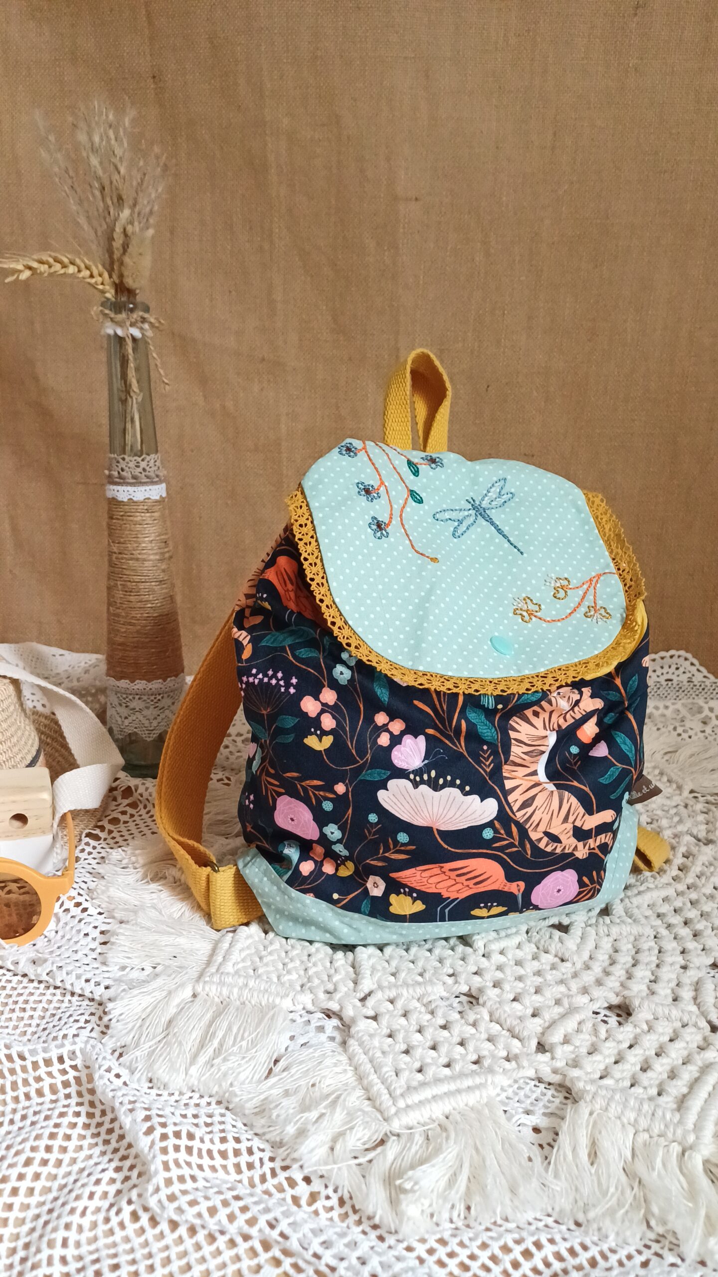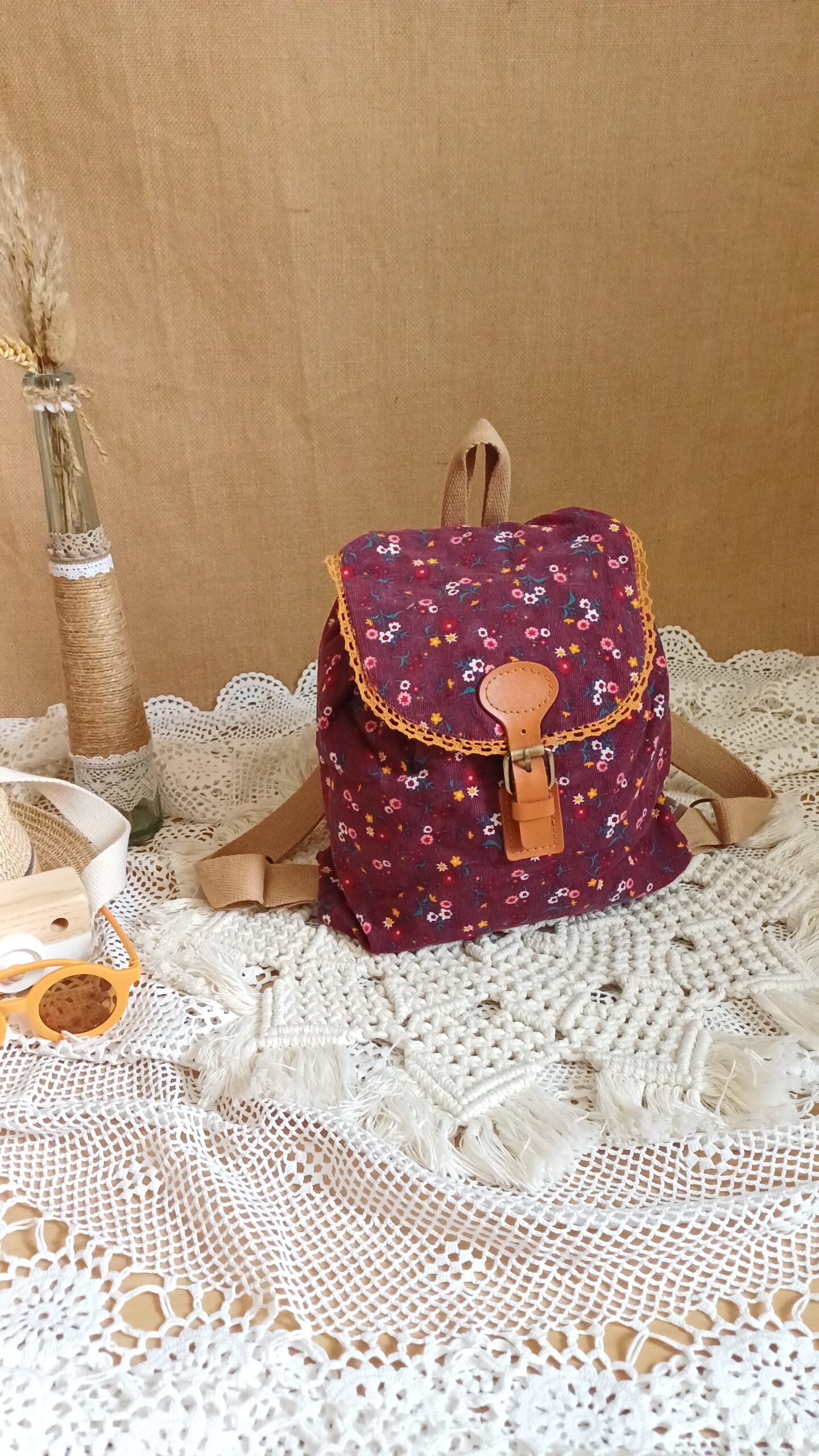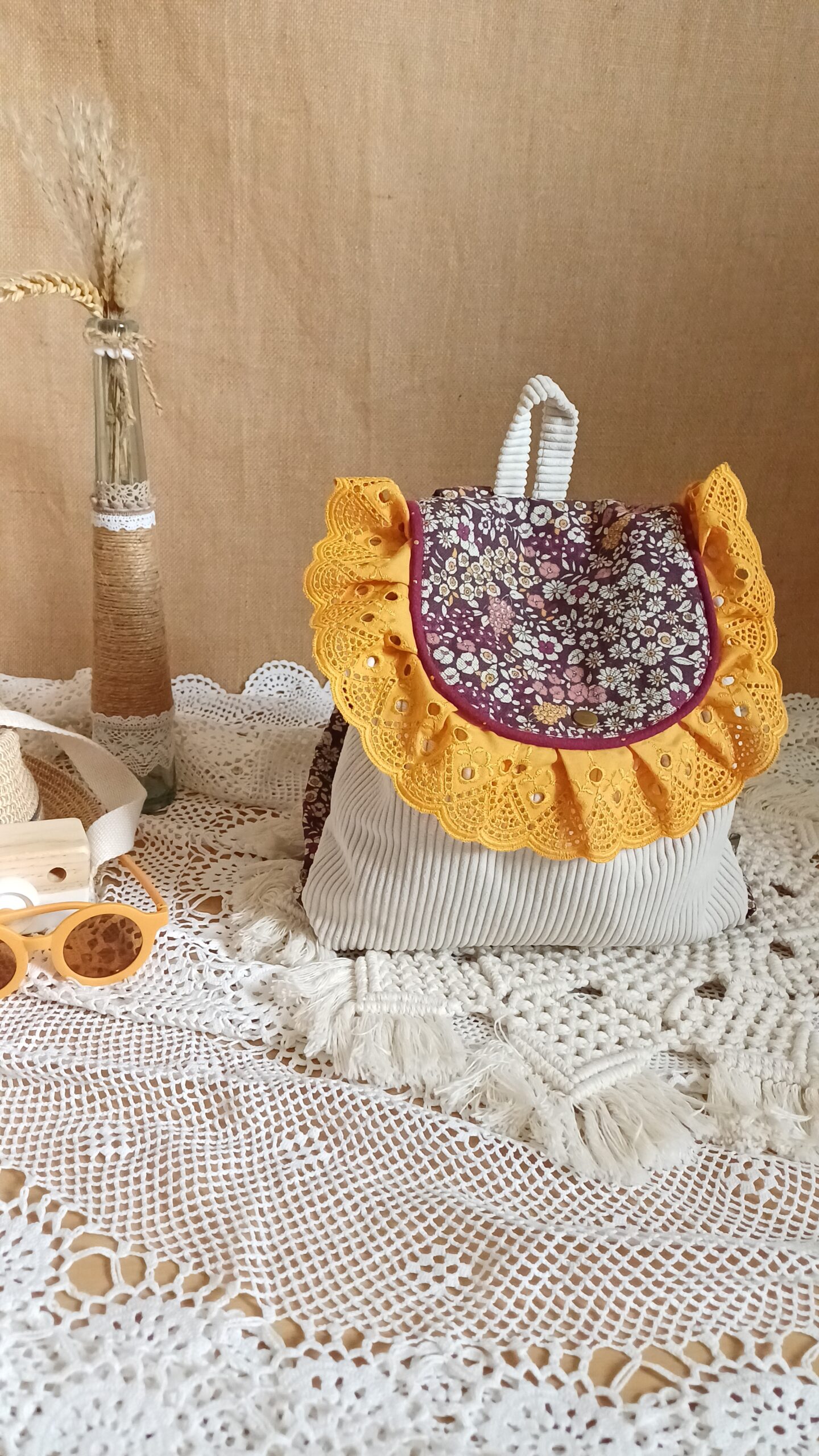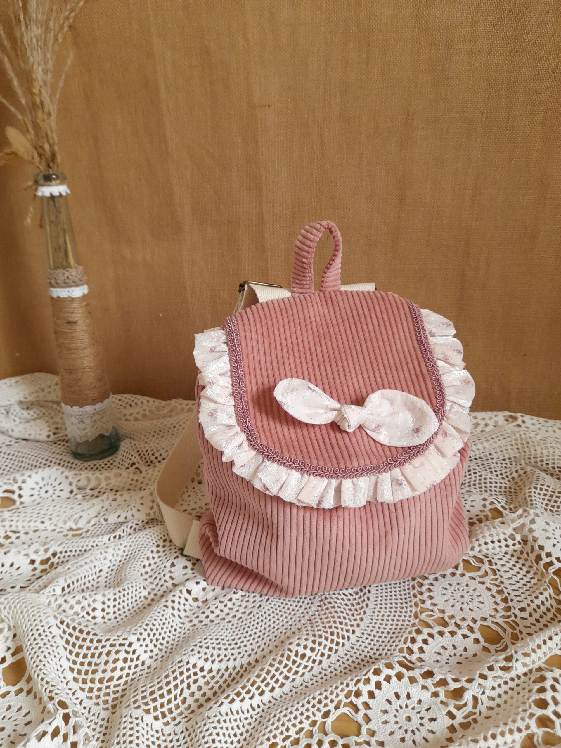 Idéal pour la première rentrée à la crèche et à l’école. Bébé pourra aussi y glisser tous ces petits trésors. Matière velours côtelé vieux rose avec noeud et froufrou assortie. Bretelles en sergé de conton réglables. Poche intérieure. Se ferme par un bouton pression Taille bébé/enfant